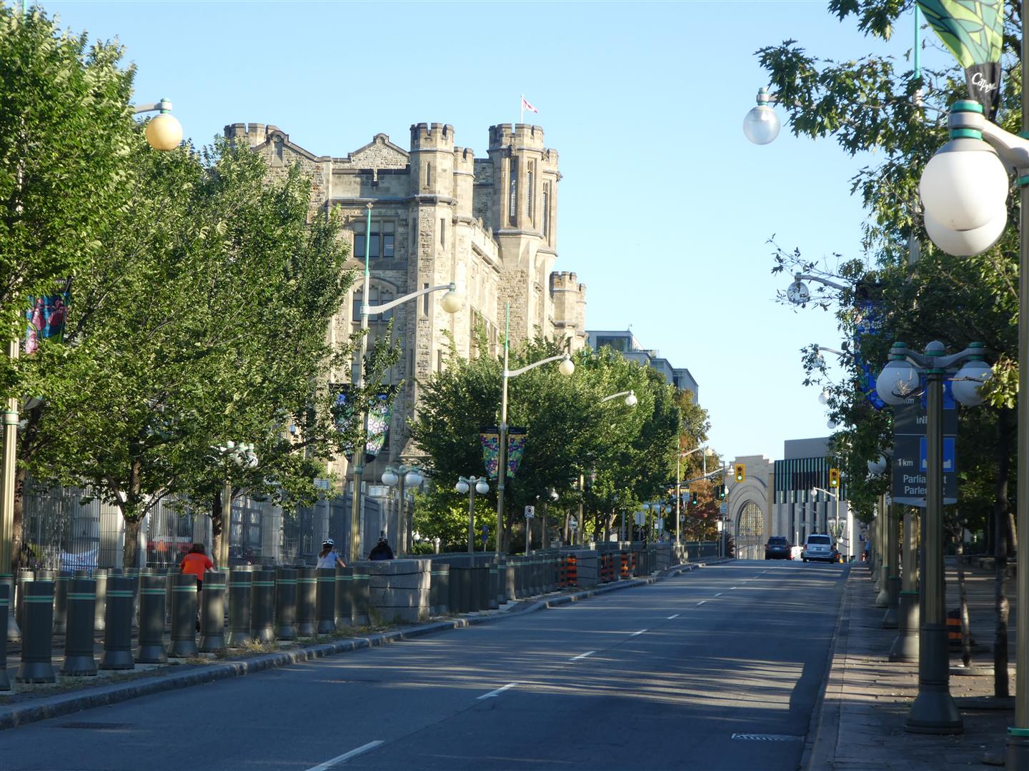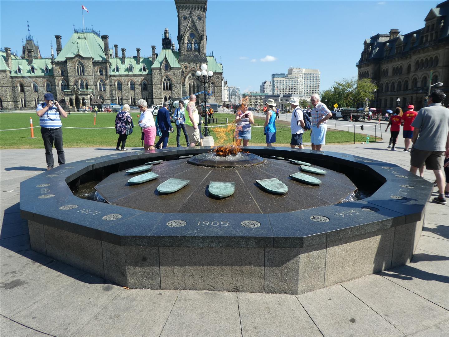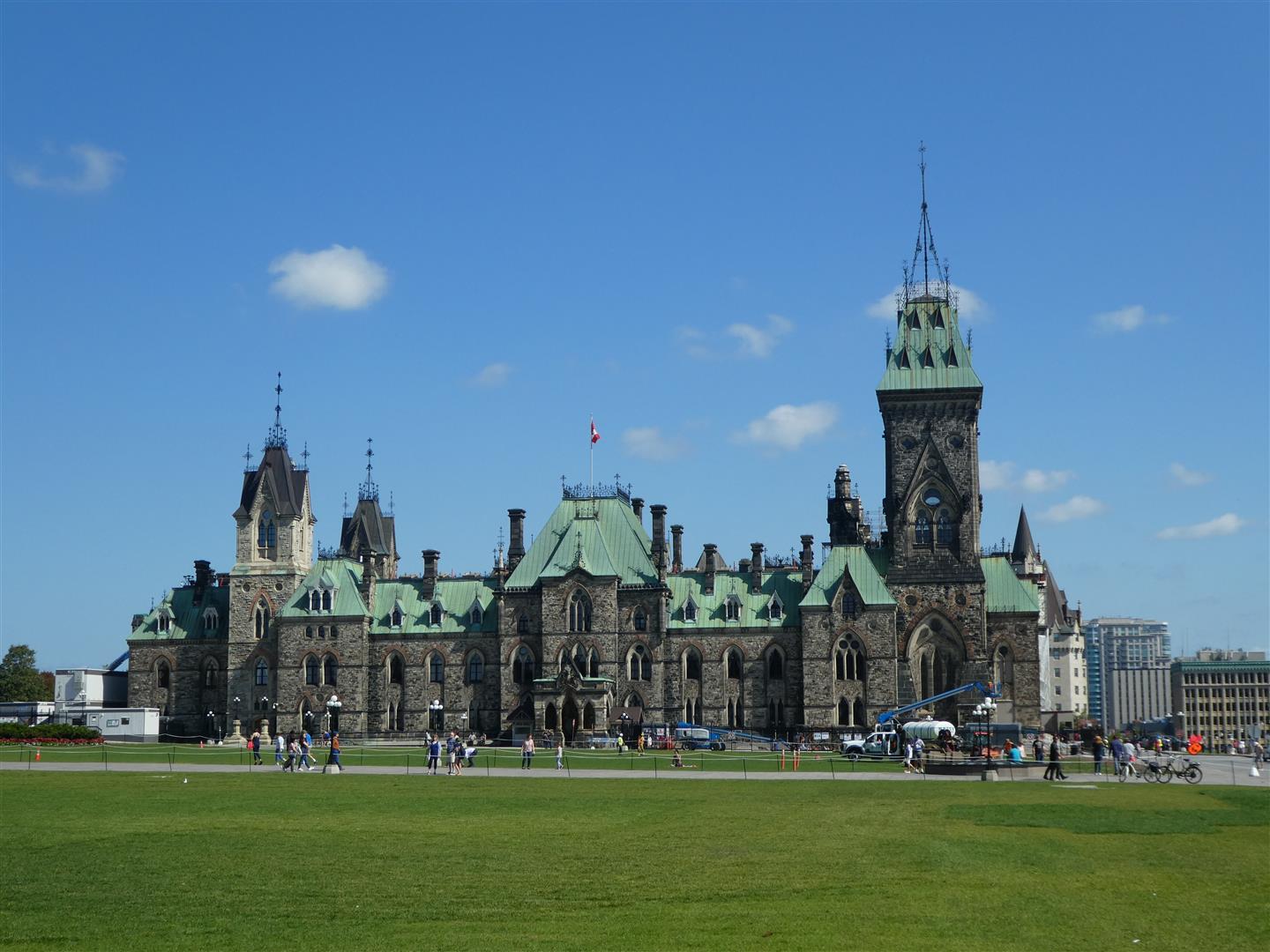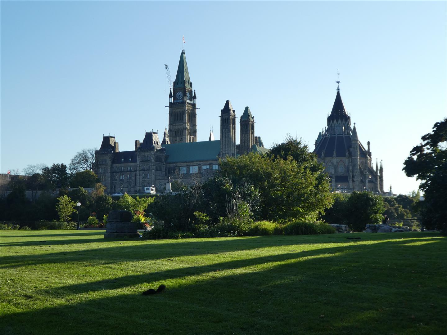Aan de noordwesthoek van het plein verrijst Parliament Hill (zie foto hierboven), waarop hoog boven de Ottawa River de regeringsgebouwen staan. Deze bepalen het silhouet van de stad. In 1860 legde de Engelse kroonprins Edward de eerste steen voor de drie statige, in neogotische stijl opgetrokken gebouwen. In 1867 waren het East, West en Centre Block gereed, mooi op tijd voor de eerste zitting van het kersverse parlement van de Dominion of Canada. Met hun torens en kopergroene daken doen ze denken aan Westminster en Buckingham Palace in Londen.