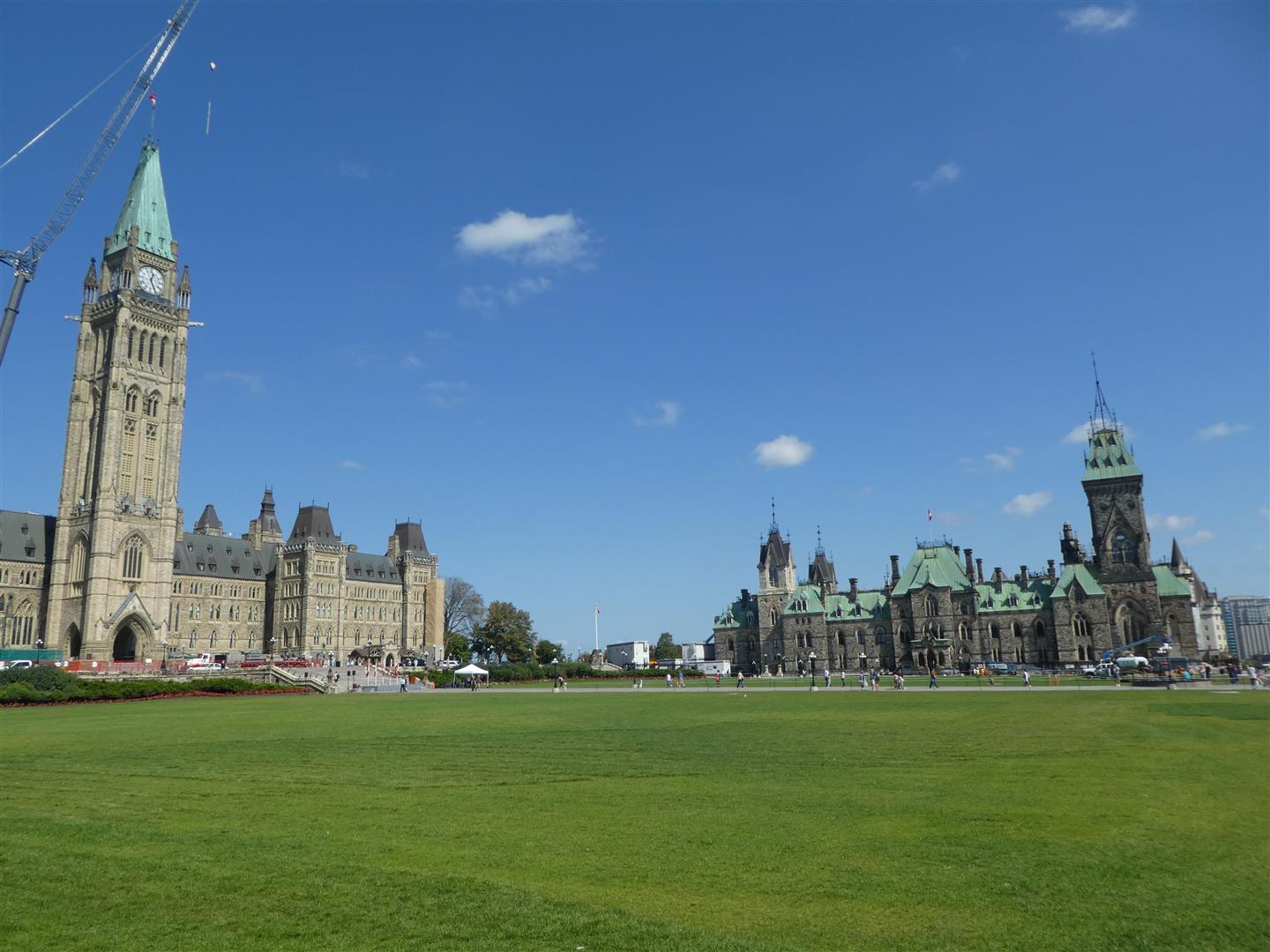 1) Parliament Hill: Parliament Hill, hoog gelegen op een rotsformatie boven de Ottawa River, is het politieke centrum van Canada. Het bestaat uit drie immense bouwwerken, die met hun torens en steile, groen uitgeslagen koperen daken doen denken aan kastelen. Het Centre Block, waarin het Lagerhuis en de Senaat zijn ondergebracht, is het grootste. Boven beide vleugels verrijst een enkele klokkentoren, die hoog boven de gebouwen uitsteekt. Die toren staat bekend als de Peace Tower. Hij is ruim 90 meter hoog en werd in 1927 gerealiseerd als gedenkteken voor de 60.000 Canadezen die het leven lieten tijdens de Eerste Wereldoorlog. Nu is het een eerbetoon aan alle Canadezen die hun leven hebben gegeven voor hun land. In het Centre Block worden dagelijks rondleidingen gehouden, en in de House of Commons kunnen bezoekers de debatten volgen.