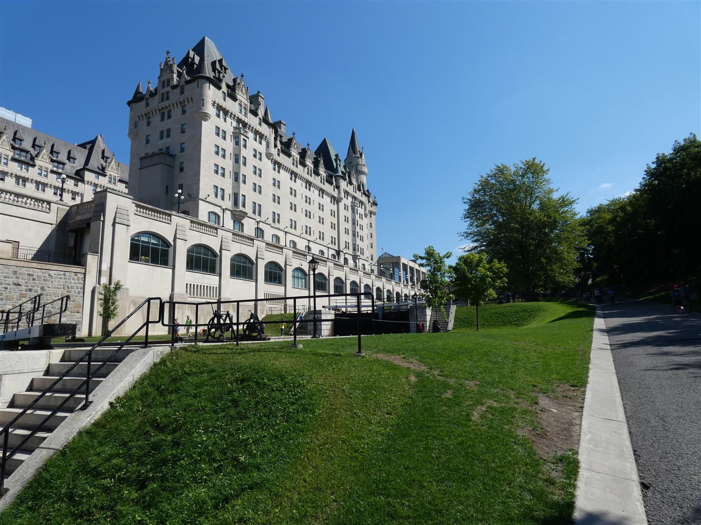 Het terras van Château Laurier biedt goed uitzicht op de sluizen en stuwen van het Rideau Canal, dat hier uitmondt in de Ottawa River. 's Zomers is het hier een komen en gaan van pleziervaartuigen. Net als een eeuw geleden worden de oude sluizen, de Ottawa Locks nog altijd met de hand bediend.